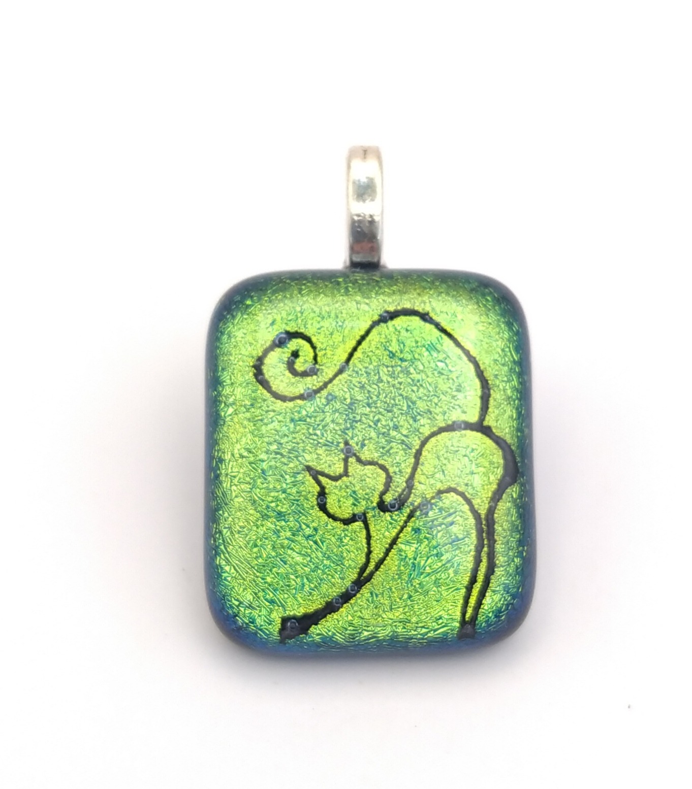 Fusing technikával készült üvegmedál, több réteg összeolvasztásával. Egyedi kézműves termék. Mérete: 2×2,3 cm